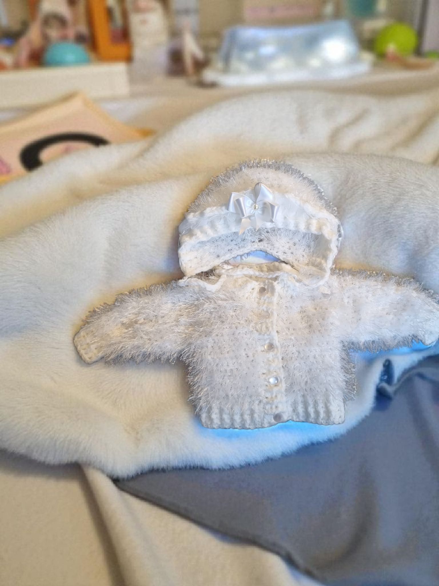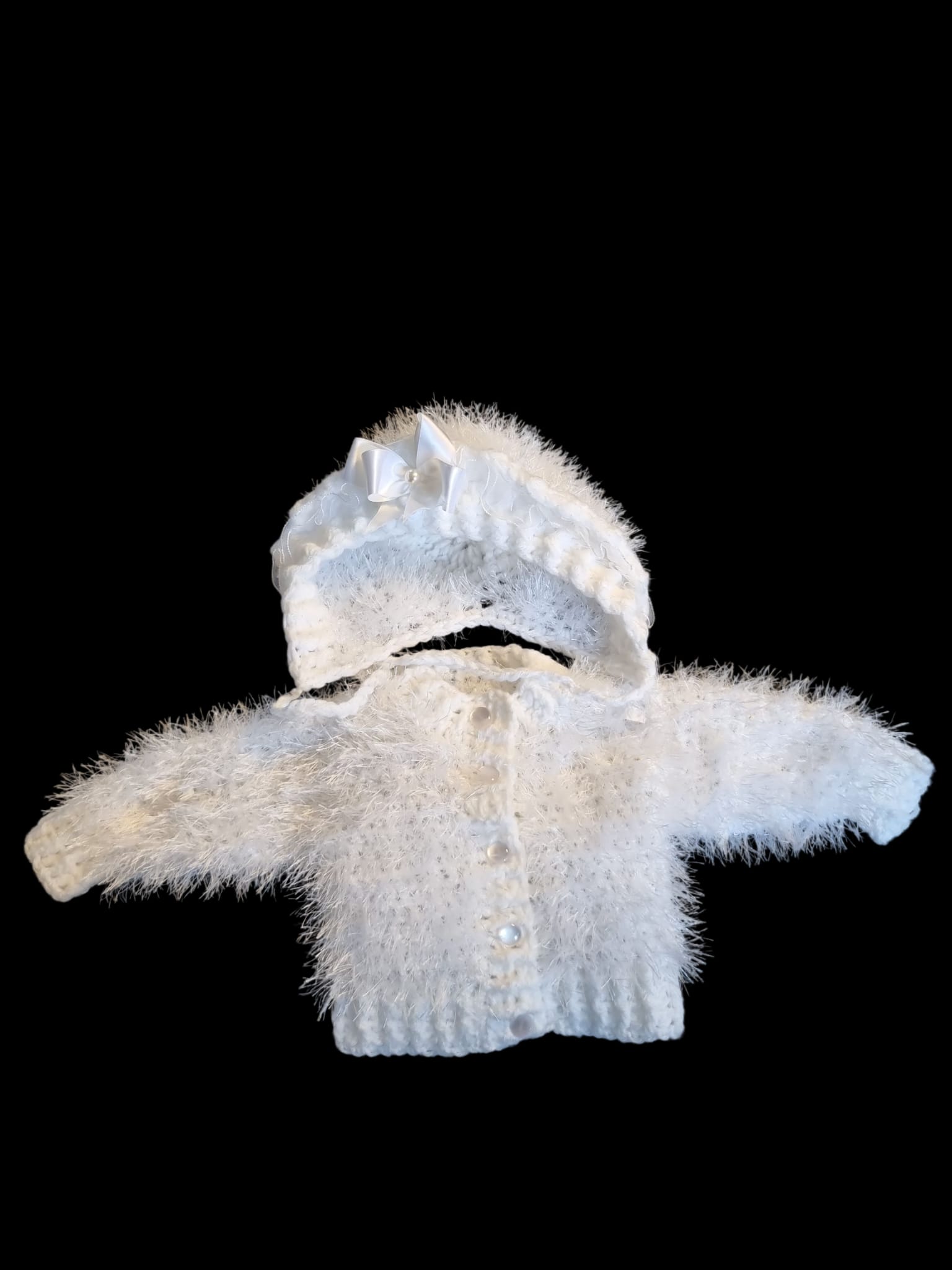 This beautiful baby set has been lovingly hand-knitted in soft, fluffy white yarn, perfect for keeping your little one cozy and stylish.